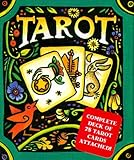 If you don’t feel compelled to get a traditional, serious, Rider-Waite-ish deck, and you have decent eyesight, this is a charming (and cheap) Tarot deck. A small hardback interpretive booklet dwarfs the little box of cards attached to it by a black ribbon. The cards are exactly the height of a nickel, perfectly reduced versions of the Nova deck. They have sharp graphics, attractive colors, and a homey presentation of the conventional Tarot cards and their meanings. They come printed on one long accordian-folded strip, perforations between each, but I recommend cutting them apart with scissors to avoid the fuzzy paper bumps left by perforations. It’s more fun than a chore, because it gives you a chance to examine and bond with each card. My quibbles, like the deck, are small: 1) Watch out. It’s so easy to lose things this size! 2) You can read the numbers, but the names of the suits and major arcana are too small to make out clearly. However, the corners are color coded–blue for cups, green for pentacles, etc–and there’s normally a recognizable cup or sword or whatever in the graphic. 3) The booklet’s interpretations remind me of cheap newspaper horoscopes and all start sounding the same to me; I think half of them tell you to take a break or reconsider your options or be alert for new opportunities. I prefer Tarot books to tell you the fundamental Idea underlying each card and keep advice to a minimum. E.G I’d say, “Six of swords: the Journey to Avalon. Transition, new horizons, visionquests”; or 4 of Pentacles: the Miser. If upright, frugality, if reversed, Scrooge” rather than “To achieve security and happiness you’ve got to plan your goals carefully” for the 6 of s. and “Manage your money with firm ethics. Respect those in power but do not accept intimidation” for 4 of p. I personally would not be able figure out the gut meaning of each card, if I had to learn from this book. The pictures themselves will teach you better–which is, in my opinion, the best kind of deck!I choose my decks for their looks, so let me finish with a visual description. The cards are black background with a whimsical “Mexican folk art” style: 6 of S. is carried aloft by a hot air balloon, for example, and 4 of P. are held by a small pig. 4 of c. is a typical blending of traditional iconography with the deck’s sense of humor: a figure is lounging at the base of a tree, contemplating 3 cups with a pensive frown, but the 4th is a shiny red apple dangling enticingly in front of his face–only very close inspection reveals the green worm sticking out! There are several inspired and original adaptations: Judgement as a butterfly holding a key, or the hermit sporting a snail shell on his back, or the 3 of S. as the heart-shaped root of a plant whose leaves being snipped off by the swords. The devil, always a troubling card, is for once neither too hideous to bear looking at nor so censored the meaning’s obscured: a tiny dancing red figure sticks out a lizard tongue and has the manic smile of a demonic car salesman. There are plenty of traditional Rider-Waite-inspired cards: the sleeper rising from the bed and hiding her eyes for 9? of s., the man with 10 sticks on his back, the Hanged Man in his usual pose. All are as simple as possible. Few stray too far from the core Rider-Waite ideas, but all pretensions and esoterica have been cheerfully ditched apart from a few tiny zodiac signs. At the moment the publisher, has a photograph of one of the cards on their web site.